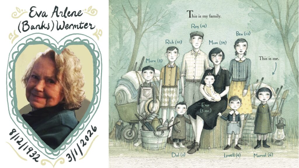 Last month, our great-aunt Eva passed away at 93 years old. She was the last remaining of the eight ‘Banks Kids’, the close-knit family whose (partial) story I told in ‘Home in the Woods’. (Eva’s obituary is here). When I was working on making my grandma Marvel and her siblings’ story into a children’s picture book, I had chats with the 4 living siblings to collect whatever details they could remember from their days living in the woods surviving the Great Depression. Eva, quiet and humble, at first said that she wouldn’t have much to add because she was only…